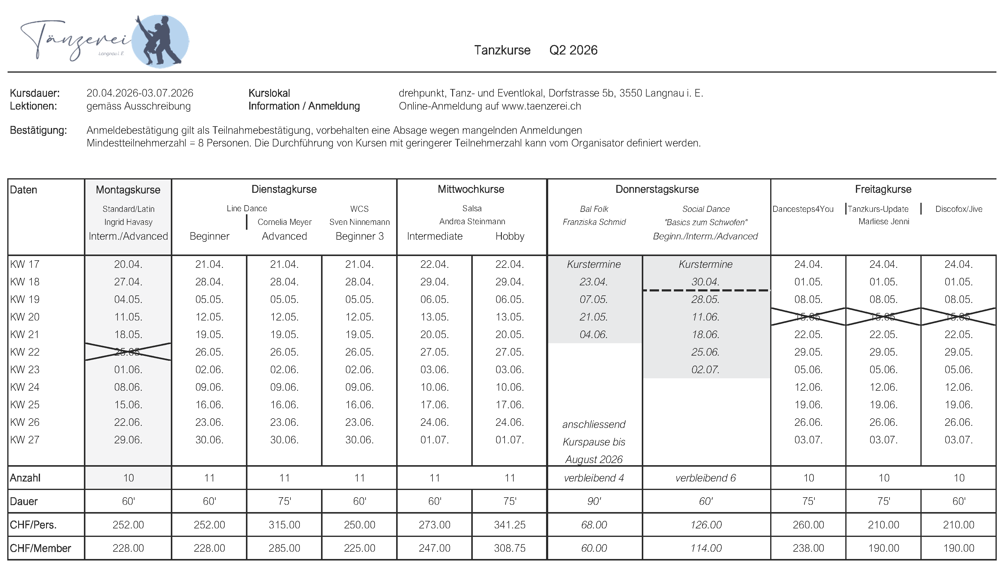 Die Anmeldung erfolgt per Onlineformular auf der Website. Die Anmeldung gilt bis auf schriftlichen Widerruf. Nach Ablauf eines Kurses werden Teilnehmer ohne gegenteiligen Bericht direkt im Fortsetzungskurs aufgenommen. Die Mindestteilnehmerzahl für reguläre Kurse liegt bei 10 Personen (Paare oder Einzelpersonen), wobei es dem Organisator überlassen ist, Kurse auch mit einer geringeren Teilnehmerzahl und zur Kostendeckung angepassten Lektionspreisen durchzuführen.